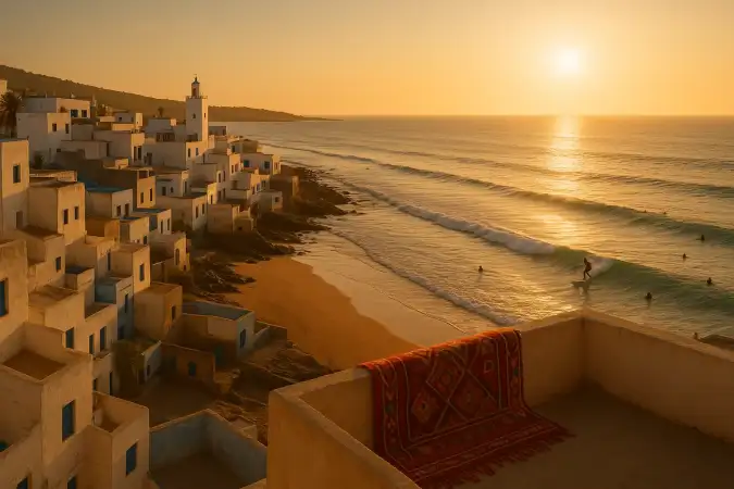 Entre l’océan Atlantique et l’Atlas, Taghazout mêle tradition berbère et modernité touristique. Les surfeurs s’adonnent aux vagues d’Anchor Point, tandis que les voyageurs profitent d’un cadre naturel préservé. Ruelles blanches, fresques colorées et saveurs locales révèlent son âme authentique.